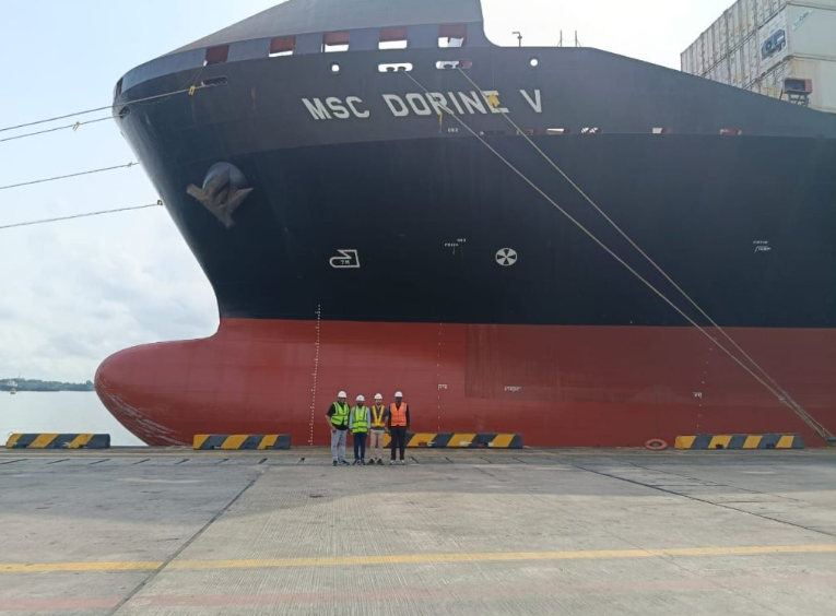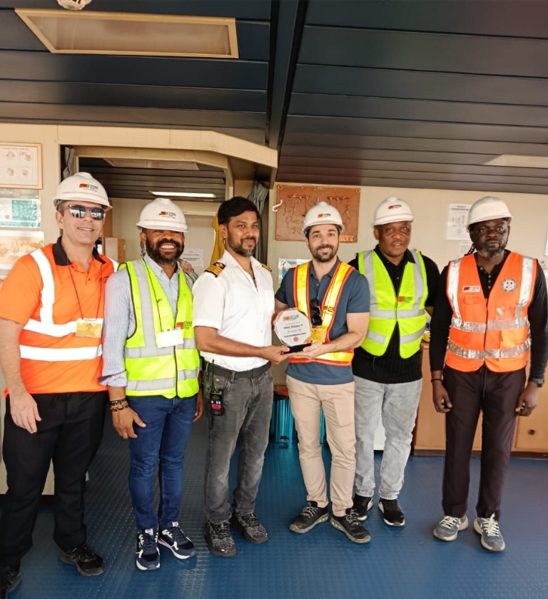 △ 昂内码头团队与 MSC 多琳 V 号船员合影(左起:OMT 首席运营官 Jim Stewart、MSC 尼日利亚东部经理 Oscar Aguocha、船长 Nithiyakumar Kartiban、OMT 总经理 Nicolo Scannavini、OMT 商务经理 Charles Okogbue、安全物流负责人 Ayodele Olatubosun)