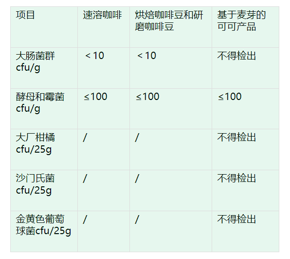 2.相关产品的一般要求和特殊质量要求,包括成分、外观、理化特性等要求,如速溶咖啡应自由流动,具有其特有颜色和风味,无异物及外来杂质,禁止添加菊苣,部分卫生限量见下表;
