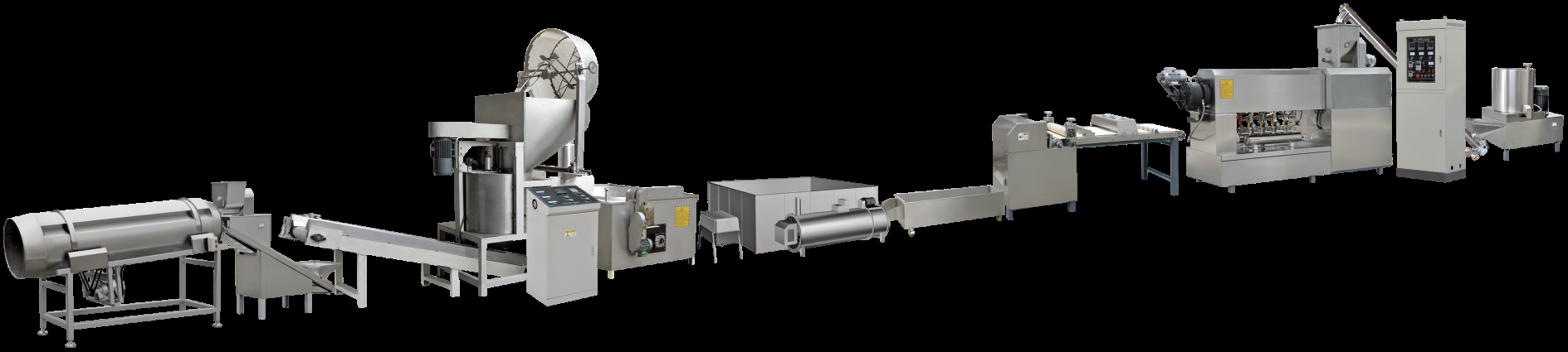 该生产线是以面粉、玉米淀粉、马铃薯淀粉等为原料,经过挤压、熟化、成形、干燥、油炸、膨化的一种小食品。 经过不同的模具可以生产出贝壳、螺旋、方管、圆管、藕片、刺螺、肥肠等花样新颖、形状独特的产品;再经过油炸膨 化后,即成为香脆可口,味道鲜美的食品。是目前市场上消费者比较喜爱的一种休闲食品。该生产线设计合理,自动化 程度高,参数控制精确。