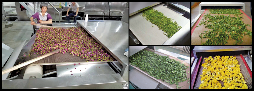 ▪ 适用物料:广泛应用于金银花、菊花、玫瑰花等各种花卉, 各种新鲜蔬菜和各类茶叶等微波干燥。