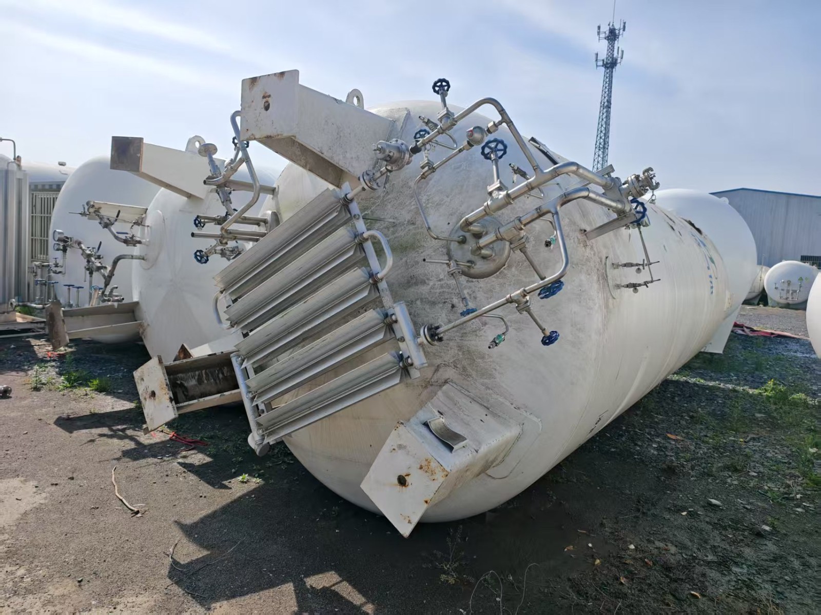 It adopts a double-layer vacuum insulation structure, with a distance of 300 mm between the carbon steel shell and the stainless steel liner, and the interlayer is filled with pearlescent sand and vacuumed. The volume can reach 150 m³ (3.72 m in diameter and 22.45 m in height), with an empty mass of about 50 tons and a full load of 123 tons. It contains 7 process pipelines (such as gas phase pipes, liquid inlet pipes, overflow pipes, etc.), a safety discharge device is installed on the top, and a vacuum pipe and a vacuum measuring pipe are configured at the bottom. The outer wall integrates safety facilities such as fire sprinklers and lightning rods.